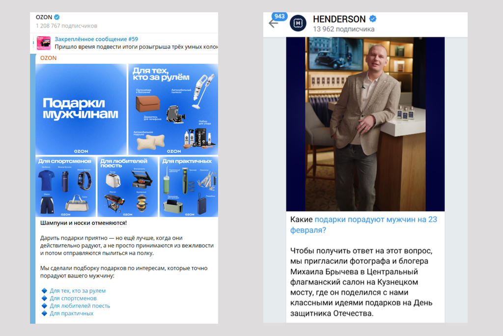 Скачать PDF-инструкцию «Где и как публиковать широкоохватные статьи бесплатно»К примеру, Ozon сделал карточки с презентами по интересам, а бренд Henderson записал ролик с фотографом и блогером Михаилом Брычевым, который подсказал подписчицам идеи подарков для деловых мужчин.