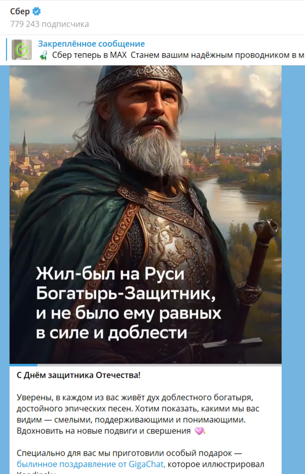 Так, «Сбер» сделал видео к 23 Февраля в стиле русских былин и заодно продвинул свою нейросеть GigaChat.