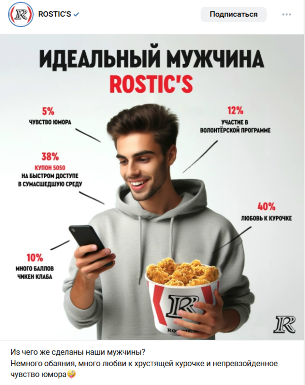 - представления о «настоящих мужчинах». Например, по мнению Rostic’s, идеальный парень любит курицу и копит баллы программы лояльности сети, ну и без чувства юмора не обойтись.