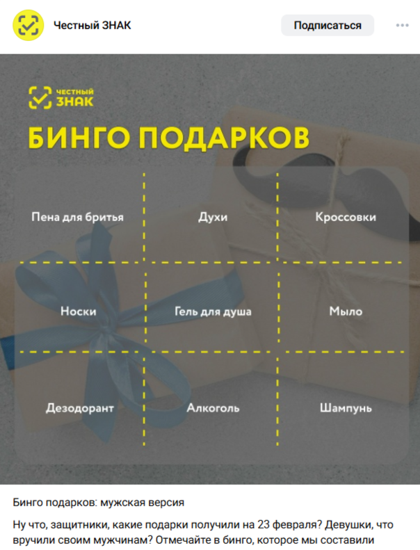 Аналогичный вариант — сделать готовые открытки, которые подписчицы смогут пересылать своим мужчинам. Чтобы в поздравлениях была изюминка, используйте юмор, отсылки к вашей сфере или поп-культуре.