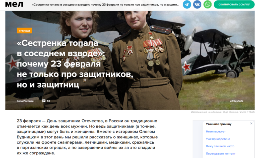 Например, журнал «Мел» выпустил статью о роли защитниц в Великой Отечественной войне.