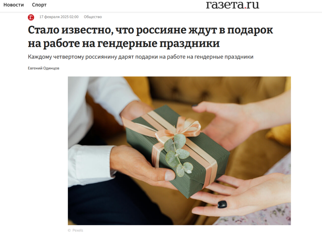 Гендерные праздники — отличный повод провести свое исследование, чтобы заинтересовать аудиторию и попасть в СМИ.В преддверии 23 Февраля можно затронуть темы, связанные конкретно с праздником — отношение к дате, желаемые подарки, варианты празднования. Например, в 2025 году hh.ru и «Золотое яблоко» провели совместный опрос о корпоративных подарках. Также будут уместны исследования на тему исторической памяти и патриотизма.