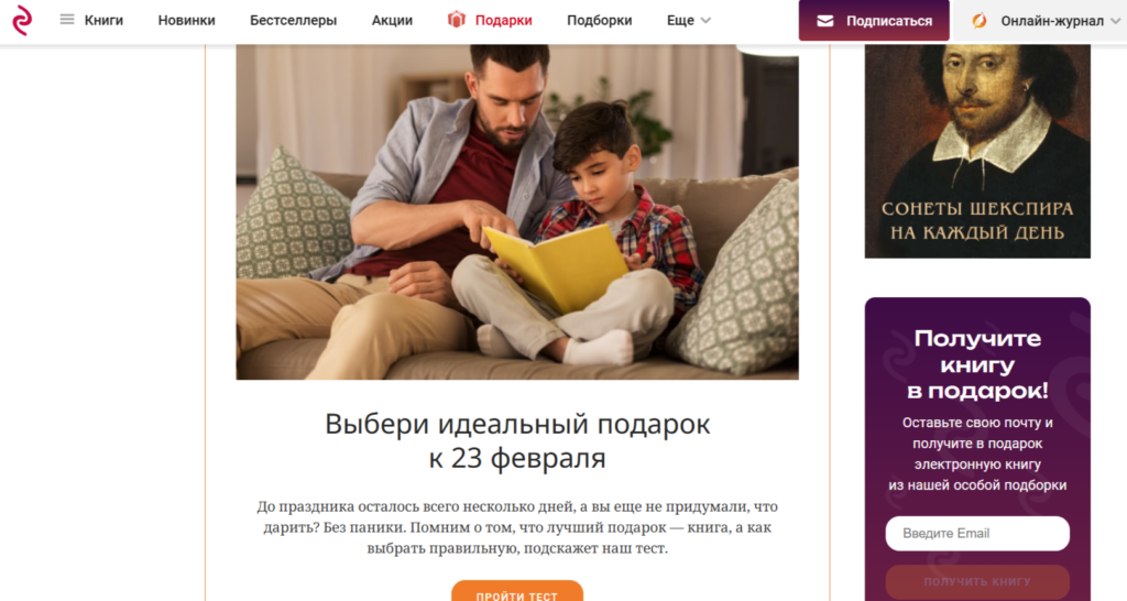 Эти интерактивы помогут вовлечь женскую часть аудитории. Можно сделать полезный тест и помочь с выбором подарков для близких: например, издательство «Эксмо» предлагает подобрать книгу по интересам.