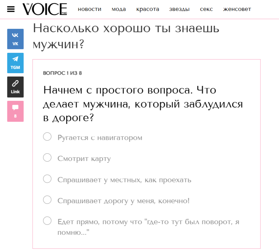Или соберите шуточный тест на знание мужчин, их типичных фраз, привычек и хобби, как сделали в журнале Voice.
