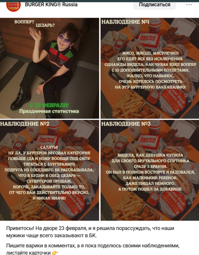 Менее серьезный вариант — внутренняя статистика вашей компании, связанная с мужской темой. Ее можно оформить в виде карточек с инсайтами: к примеру, Burger King назвал продукты, которые чаще всего заказывают парни.