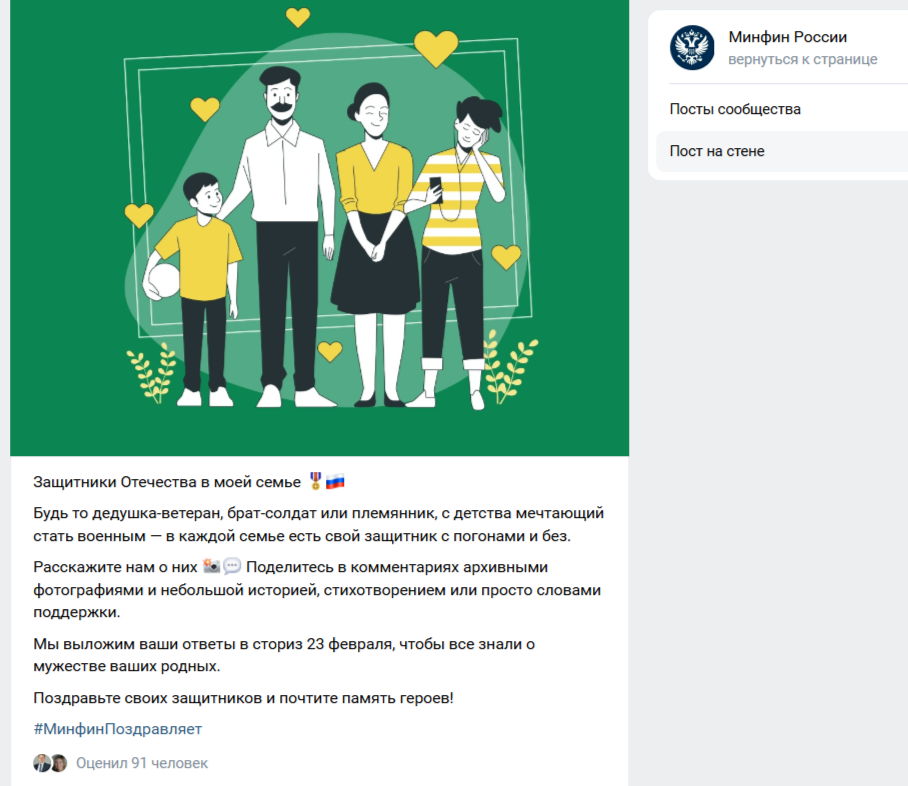 Накануне праздника предложите пользователям поделиться воспоминаниями, фото, традициями, связанными с 23 Февраля. «Защитники Отечества в моей семье» — к примеру, такую тему для обсуждения опубликовал в своем ВК-сообществе Минфин.