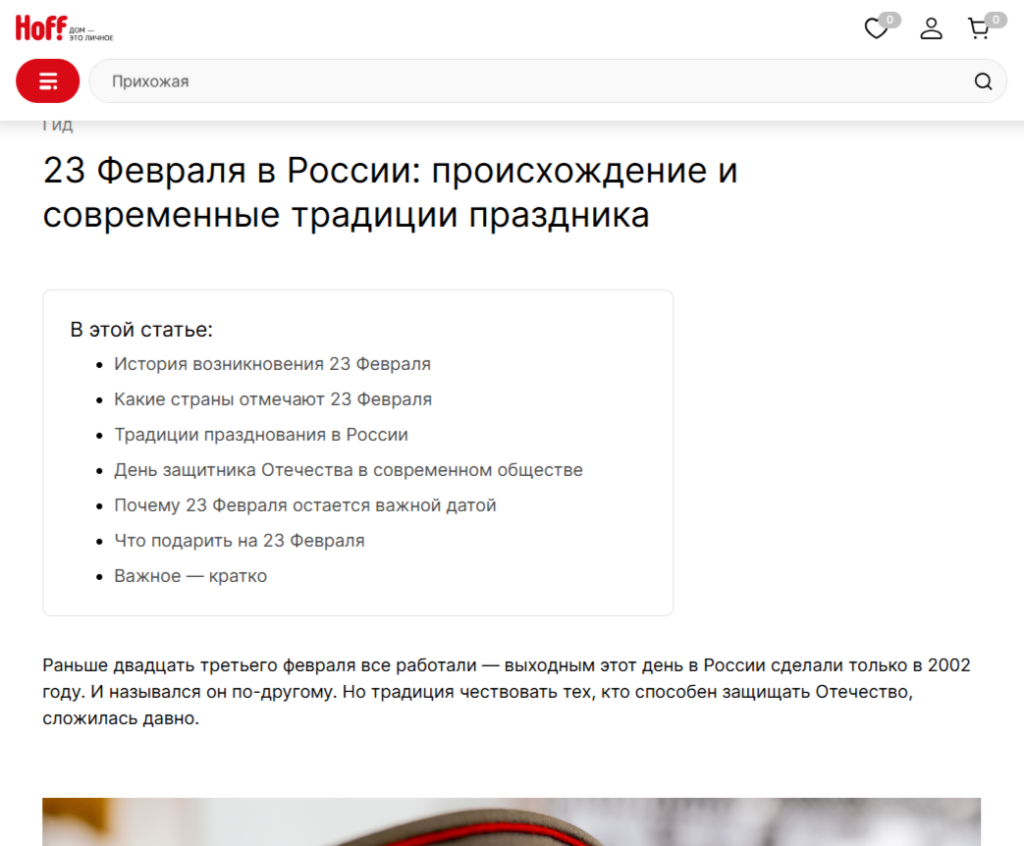 Еще одна традиционная тема, которая поможет привлечь широкую аудиторию. Как вариант, подготовьте статью: опишите, как зародился День защитника Отечества, какие есть аналоги праздника за рубежом. В конце предложите идеи подарков, как сделали в блоге Hoff. Для соцсетей же больше подойдет формат карточек с интересными фактами из истории 23 Февраля.