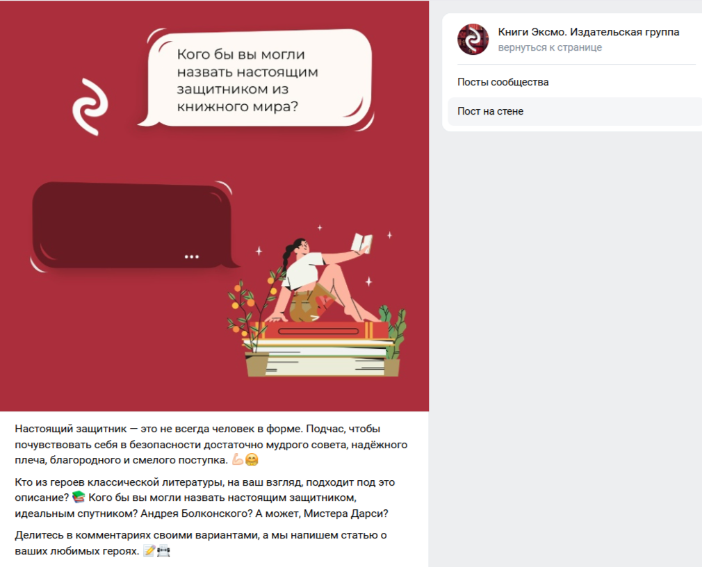 - важнейшие качества мужчины, примеры героев в истории и в жизни — предложите аудитории подискутировать. Например, издательство «Эксмо» спрашивало у читателей, кого из литературных героев они считают настоящими защитниками.