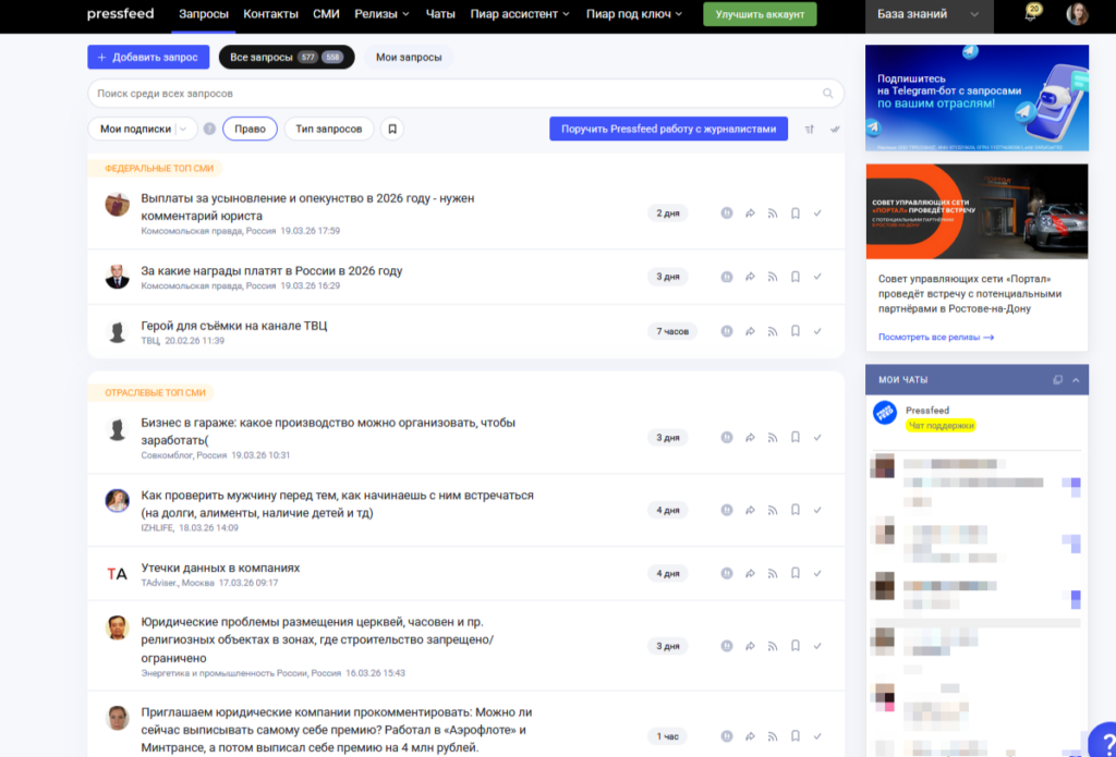 Если у вас нет времени самостоятельно налаживать связи с редакциями, у нас есть услуга «Экспертные публикации в СМИ для юристов». Специалисты Pressfeed возьмут на себя всю рутину: найдут релевантные запросы журналистов, подготовят уникальные комментарии и отследят выход публикаций. От вас нужна лишь фактура для ответов — факты и цифры, случаи из вашей практики, статистика, ссылки на документы и судебные решения.