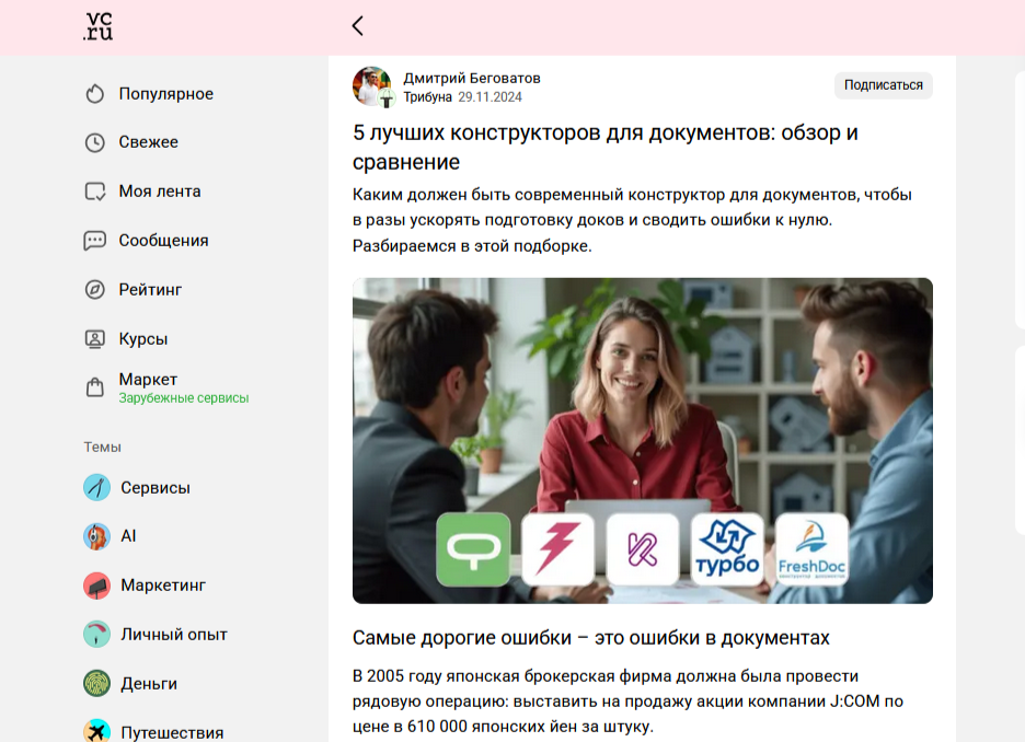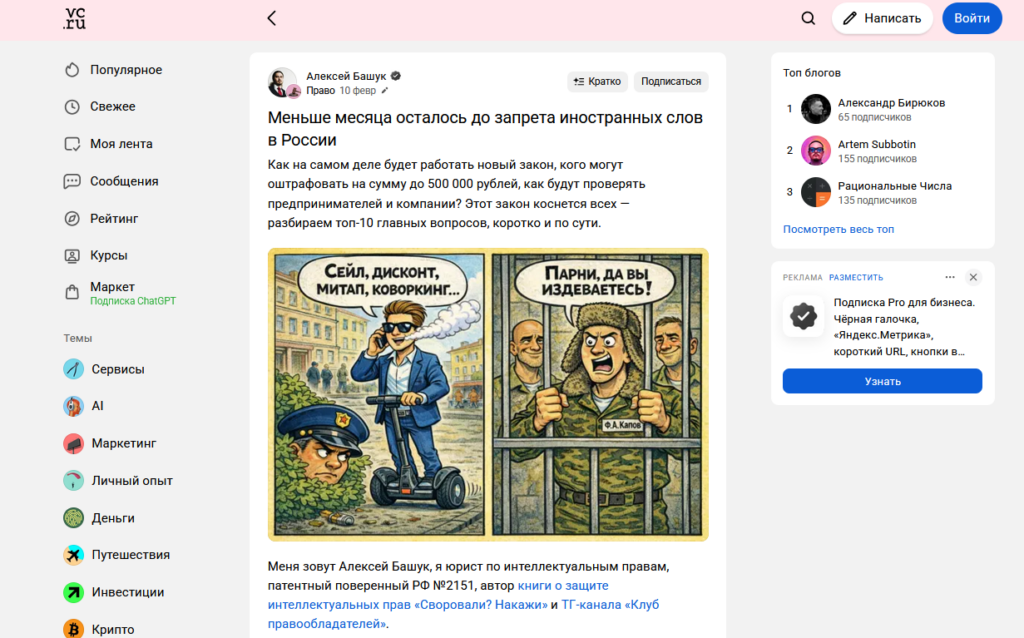 - VC.ru, «РБК Компании», «Клерк», «Т-Бизнес-секреты», Sostav — бизнес-площадки, где юридические статьи читают предприниматели и специалисты, правда, функционал для компаний чаще всего платный;