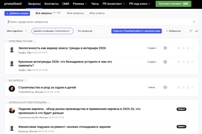 Используйте сервисы по взаимодействию с журналистами, такие как Pressfeed. Тут вы можете отвечать на запросы редакций, которые ищут комментарии специалистов для своих статей. Упоминание вас как эксперта в авторитетном издании — это мощный сигнал доверия для потенциальных клиентов.