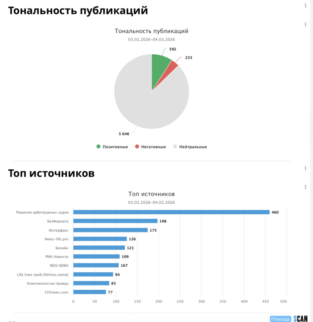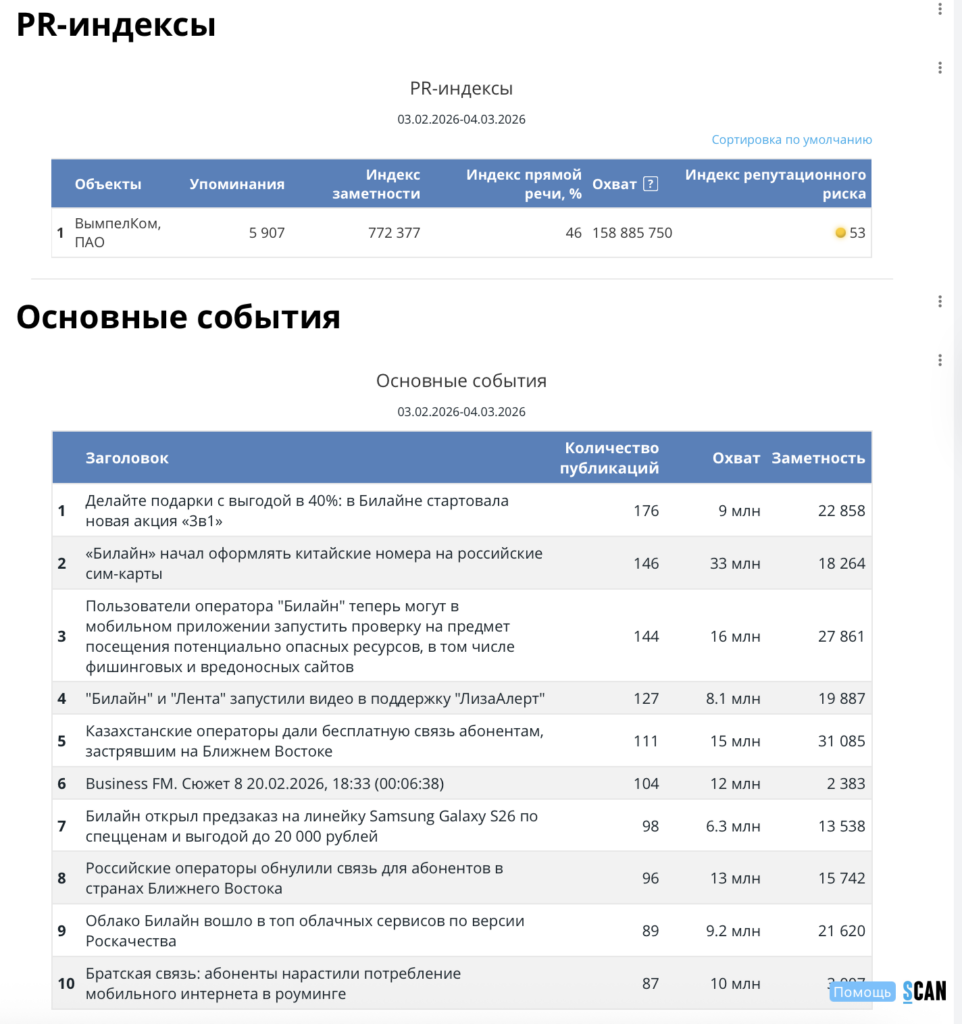 Например, по данным СКАН-Интерфакс, у ПАО «Вымпелком» («Билайн») за последние 30 дней показатели достаточно хорошие: основная масса упоминаний — нейтральная, негативный контекст почти в три раза меньше позитивного, охваты высокие (158+ млн), а индекс прямой речи составляет 46%. Тем не менее индекс репутационного риска остается средним, вероятно, из-за источников, которые чаще всего писали о компании. С большим отрывом лидируют ресурсы, которые размещают решения арбитражных судов. При этом основные события с наибольшим количеством публикаций остаются позитивными и никак не связаны с судебными вопросами.