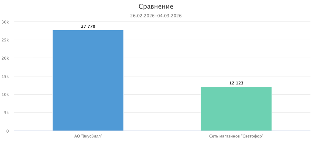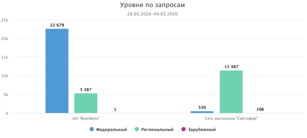 Так, «Вкусвилл» значительно опережает «Светофор» по индексу заметности в период с 26 февраля 2026 года по 4 марта 2026 года: примерно в 2,5 раза. Одна из потенциальных причин — разный уровень медиа, которые упоминали компании. «Вкусвилл» преимущественно присутствовал в федеральной повестке, тогда как «Светофор» — в региональной.
