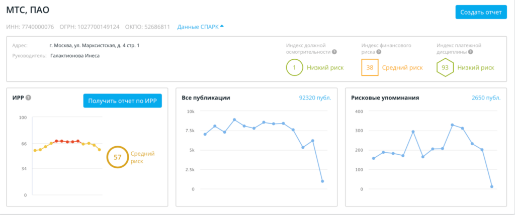 Например, сводка рисков МТС за последний год показывает, что пик кризиса пришелся на середину года. В последние месяцы ситуация заметно стабилизировалась: число риск-упоминаний сократилось практически до нуля. Положительная динамика отражается и в ИРР (индексе репутационного риска): показатель приближался к 70, а затем снизился до 57, перейдя в категорию среднего уровня.