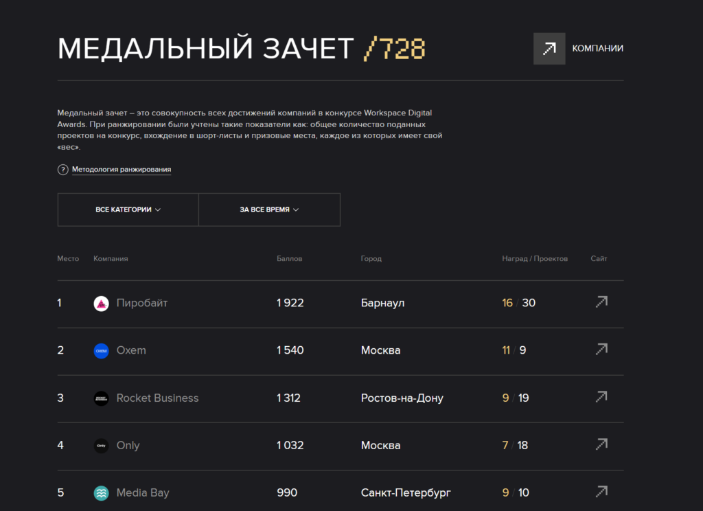Абсолютным чемпионом стал Пиробайт, заполучивший в свою копилку сразу 10 наград — это беспрецедентный результат за всю историю премии. Еще 5 компаний смогли завоевать 5 и более наград: Media Bay, Only, Oxem, Rocket Business и Vide Infra Group. А 19 компаниям удалось занять по 3 призовых места и более: ДАЛЕЕ, е—б эдженси, Пиксель Плюс, AffArts, CreativePeople, ITECH, Maze, Mediacontext, Mish Product Lab, Ninen, pinkman, Purrweb, Surf и др. Эти цифры говорят о том, что стратегия подачи множественных кейсов работает, но только если каждый из них по-настоящему качественный!Именно поэтому мы запустили медальный зачет WDA — рейтинг всех агентств-участников за все сезоны премии. По умолчанию система показывает общий результат за все годы, но можно выбрать и конкретный сезон, например, 2025-й. Теперь каждая победа не просто ценна сама по себе, но и повышает общую позицию компании в ежегодном рейтинге самых креативных агентств России.