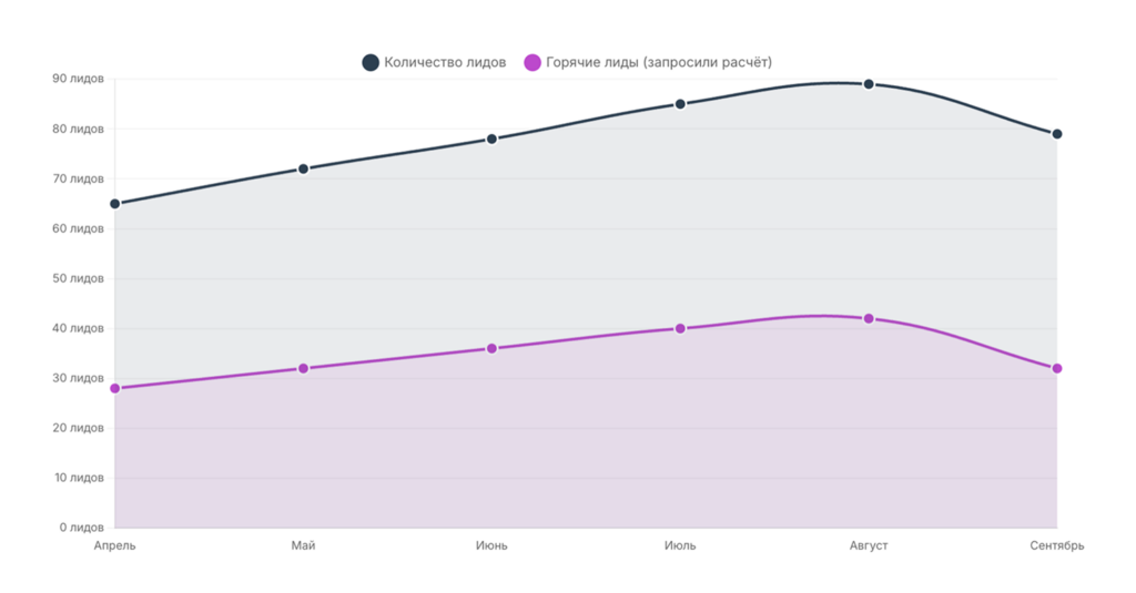 - доля горячих лидов (запросы на детальный расчет) — 45%.