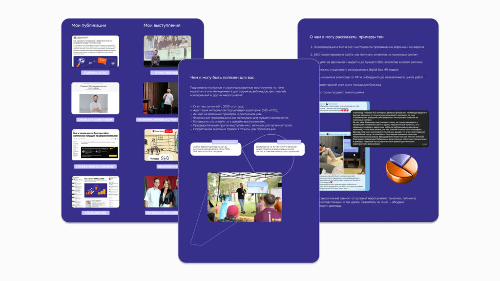 ВАЖНО: Если маркетинг-кит готовится под конкретное мероприятие, то подавать свои варианты доклада и свою специализацию нужно через призму того, кто ЦА ивента, какая философия у организаторов, какой заявлена общая тема события и так далее.