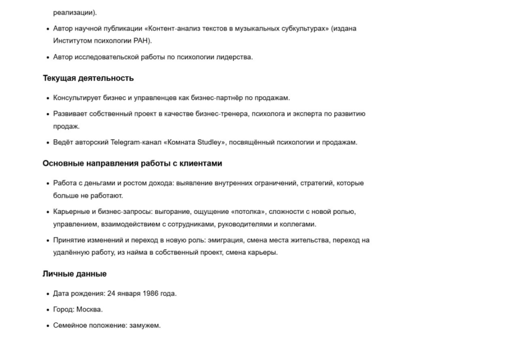На момент, когда я начала заниматься SEO-статьями, у меня уже были публикации в СМИ, комментарии для редакций и собственный Telegram-канал. Мои материалы выходили в Lenta.ru, hh.ru, «Зарплате.ру», «Фокусе внимания», Т—Ж, «МК» и других медиа. Всё это помогало укреплять экспертность, расширять охват и делать моё имя заметнее в профессиональном поле.
