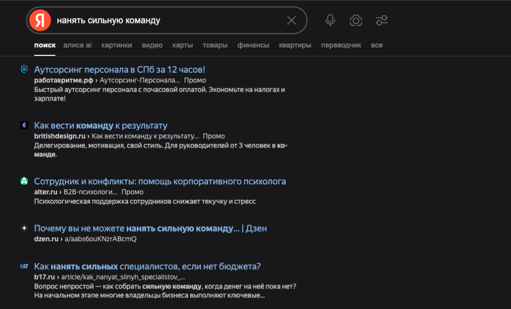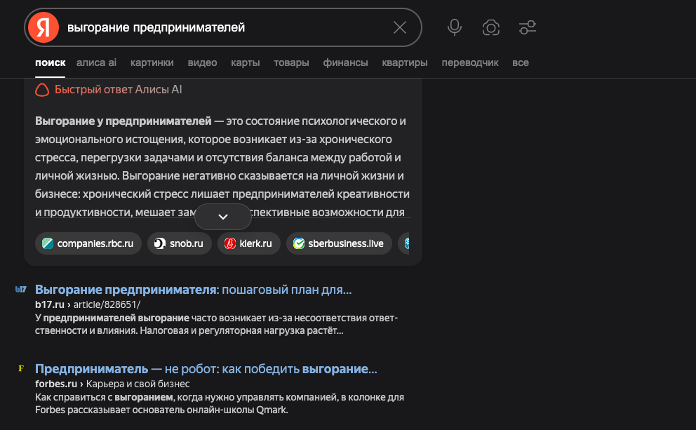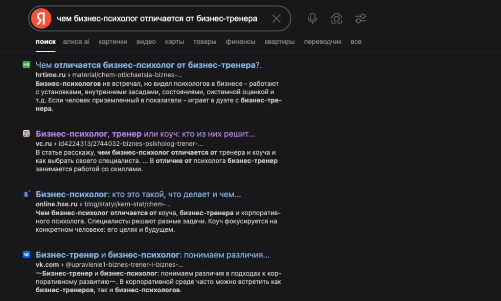 В итоге такой подход сработал. Мои статьи вышли в топ по запросам «чем психолог отличается от бизнес-тренера», «нанять сильную команду» и «выгорание предпринимателей».