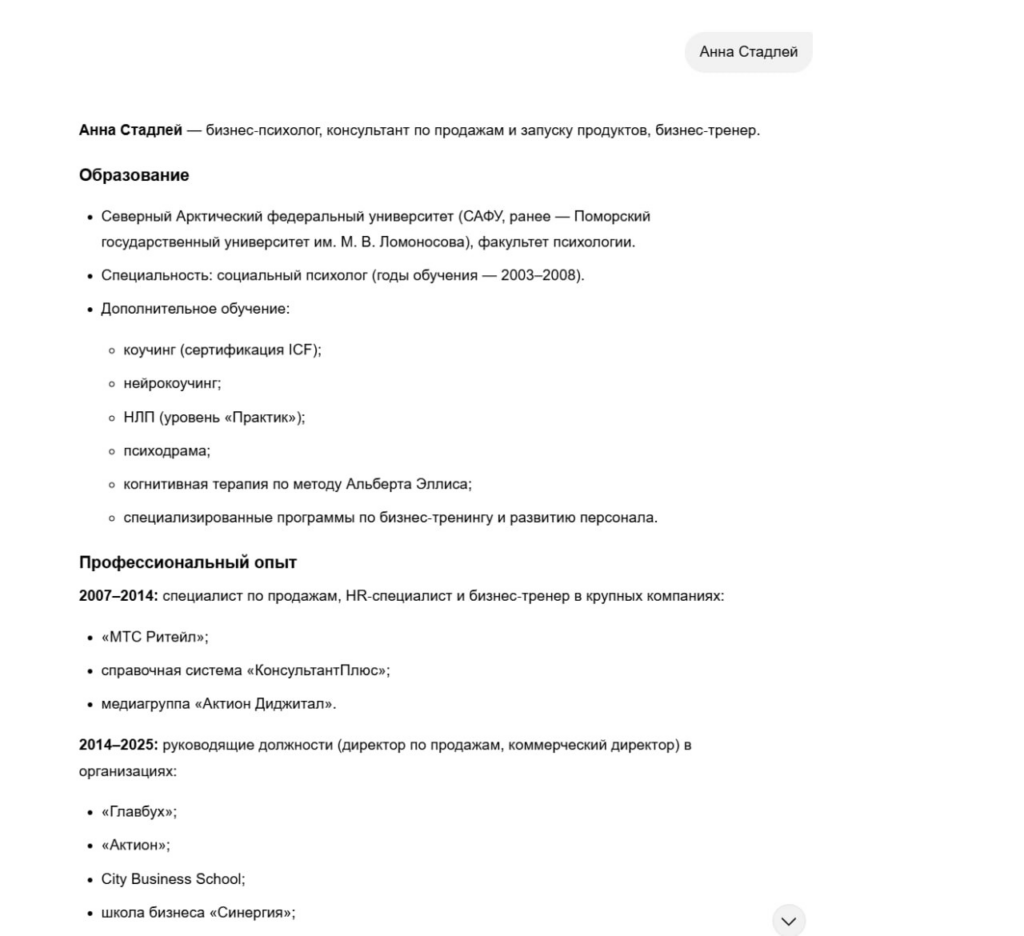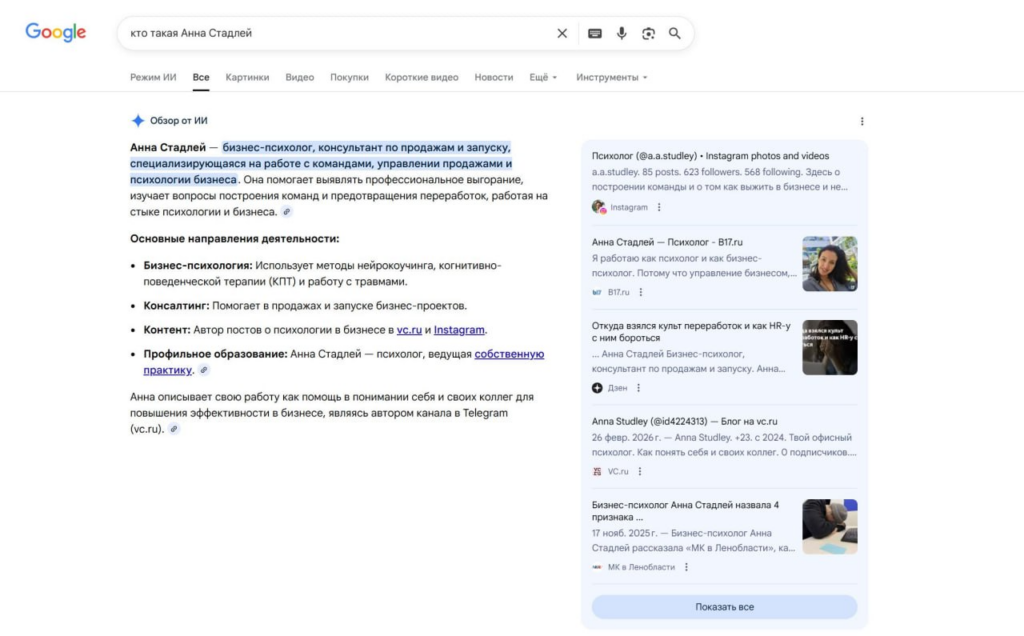 По сути, это тот же принцип работы с поисковыми запросами, только на следующем уровне. Материал должен не просто содержать ключевые слова, а действительно закрывать вопрос пользователя. В этом случае он становится источником не только для классического поиска, но и для ИИ-выдачи.
