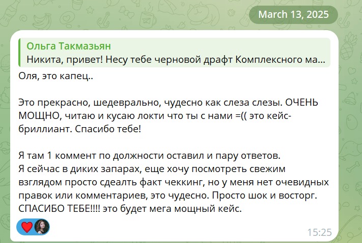 Такие дела. А зафиналим мы обратной связью от заказчика — на один из кейсов: