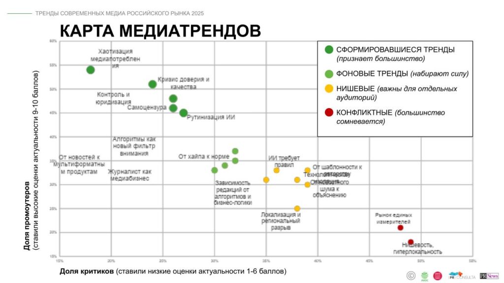 «Контролируемость медиасреды эксперты воспринимают как один из системных факторов, определяющих будущее индустрии. Определяющее влияние на создание и дистрибуцию контента переходит к инфраструктурным элементам: алгоритмам платформ, требованиям регуляторов и правовым нормам. Для редакций это вопрос выживаемости, для компаний — предсказуемости правил, юридических рисков и стоимости ошибок. Для агентств и корпоративных коммуникационных команд юридизация медиасреды стала частью операционной реальности. Увеличилось количество согласований, выросли расходы на комплаенс и экспертизу, поменялась экономика коммуникационных проектов. При этом у жестких правил есть и несомненные плюсы. Становится сложнее использовать недобросовестные практики, а значит, рынок болезненно, но все-таки движется к более цивилизованной модели».