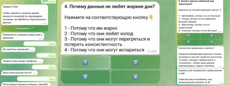 В качестве инструмента геймификации отлично подходят Telegram-боты. Так, в рамках продвижения отраслевой конференции я участвовала в разработке чат-бота, который предлагал получить предсказание и бесплатный коктейль за прохождение теста из 5 вопросов.