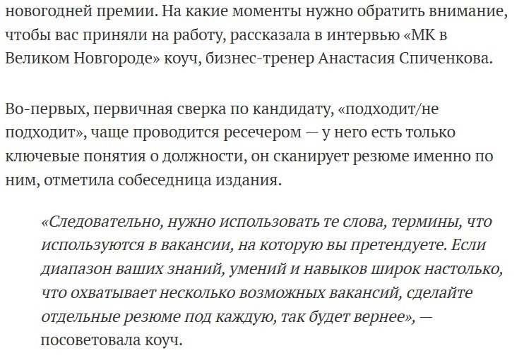 Окрылённая разговором, я полетела смотреть запросы журналистов. И в первых же увидела тему: «Как составить хорошее резюме» в издание «МК-Санкт-Петербург». Идеально под мой опыт! Я много лет работала в корпоративной среде, консультировала людей по карьере, знала все тонкости найма. Эта тема была моей.