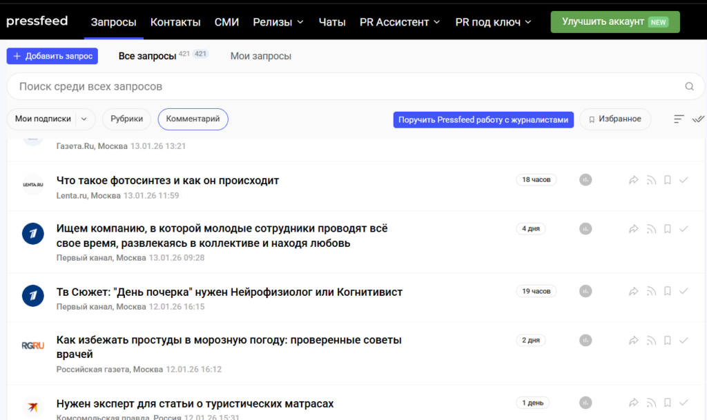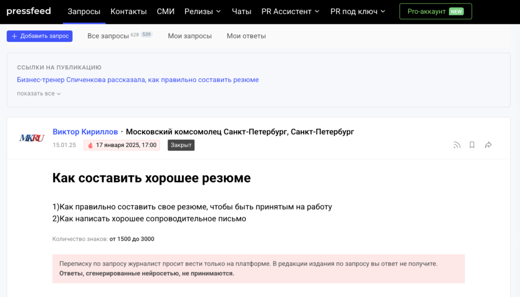 Если коротко, Pressfeed — это площадка, где журналисты публикуют запросы для своих статей, а эксперты отвечают на них. Формат простой: редакции ищут фактуру, мнения и живые комментарии, а специалисты выбирают подходящие темы и отправляют свои ответы. За счёт этого можно попасть в СМИ любого формата — от отраслевых блогов до крупных изданий вроде «Коммерсанта», РБК, «Комсомольской правды», «Известий» или региональных редакций. Оказалось, что на сервисе можно отправлять 3 бесплатных питча в месяц.