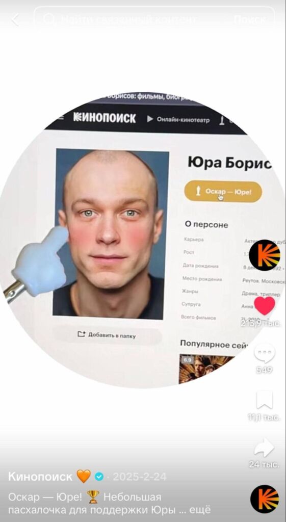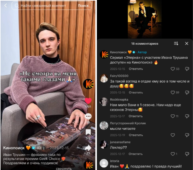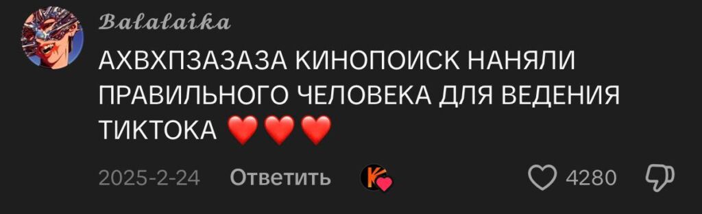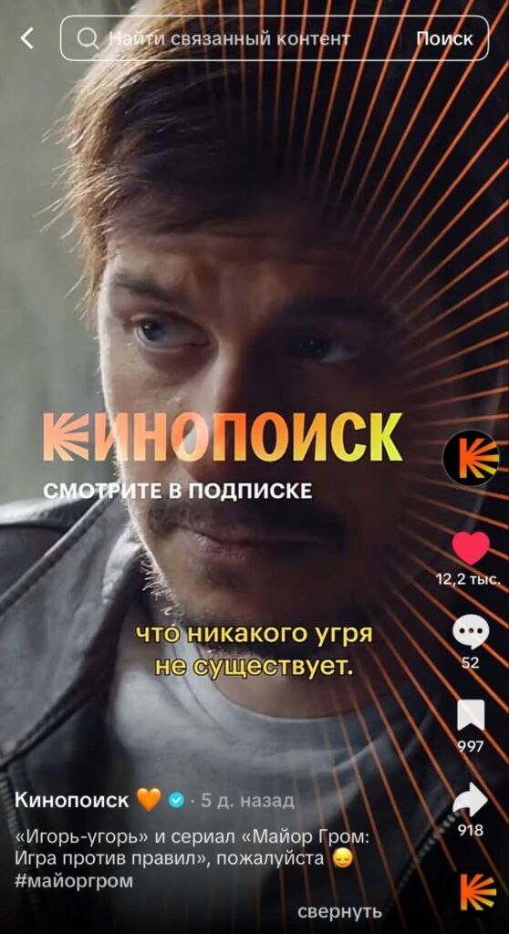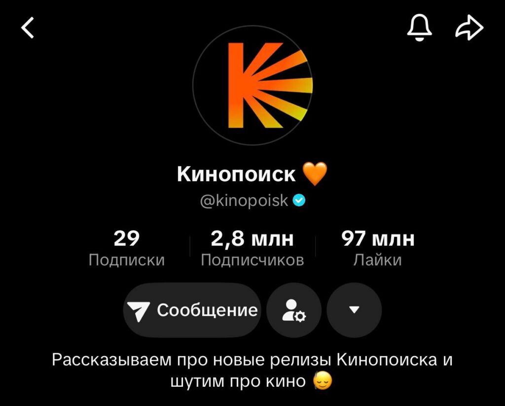 Например, у платформы «Кинопоиск» целевая аудитория достаточно широкая — кино смотрят и любят все. В TikTok-аккаунте Кинопоиска — ядро 16-24.