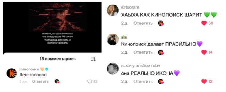 Сейчас мы используем такие соцсети, чтобы рассказать о новинках онлайн-кинотеатра — делаем нарезки фрагментов и эдитов из библиотеки «Кинопоиска», снимаем трендовые видео с артистами на съемках фильмов и сериалов и выстраиваем атрибуты бренда на широкую аудиторию.
