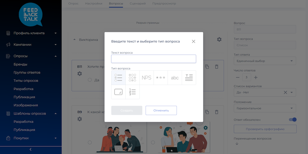 Конструктор позволяет создавать различные типы вопросов (NPS, текстовые, графические, табличные и др.). Приглашать респондентов можно с помощью общей ссылки, виджета на сайте или персонализированных рассылок по email, SMS и в Telegram.
