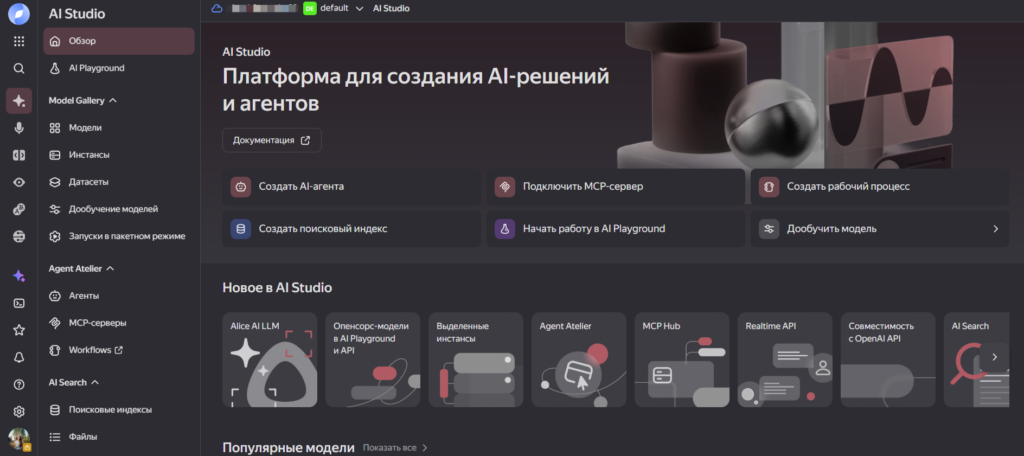 - широкий выбор ИИ-моделей — доступны генеративные нейросети «Яндекса» последнего поколения, модели синтеза и распознавания речи, а также опенсорсные LLM и VLM (например, Qwen, OpenAI OSS, DeepSeek);