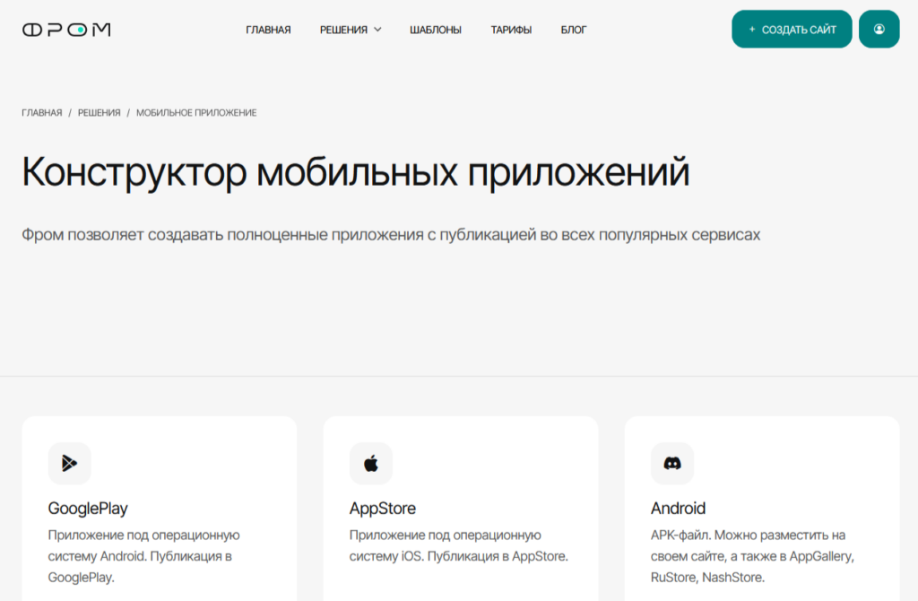 «Фром» — российский конструктор сайтов и мобильных приложений. Подойдет тем, кто хочет создать и опубликовать свой проект в GooglePlay, AppStore либо как APK-файл.