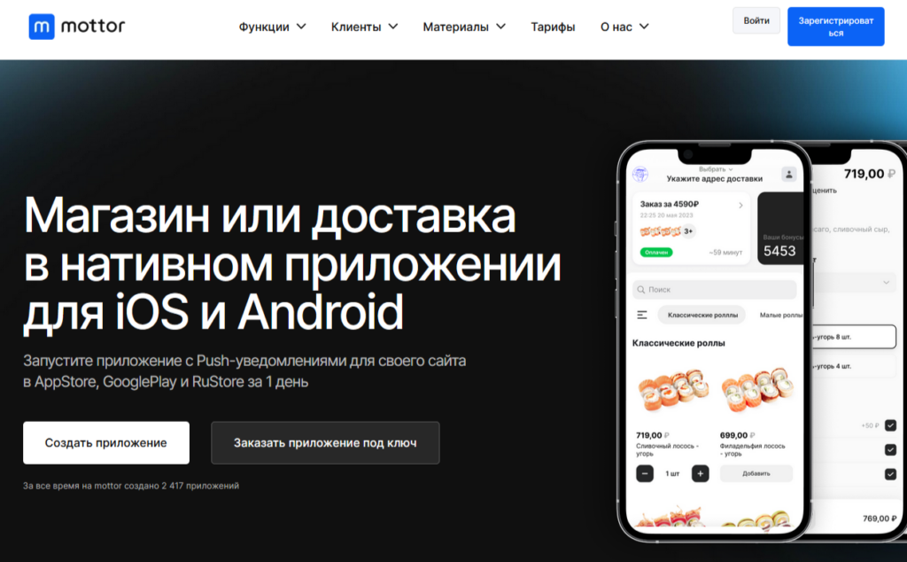 У конструктора сайтов Mottor есть также инструмент для создания приложений. Он позволяет готовить нативные приложения для магазинов и сервисов доставки с интеграцией в уже действующий сайт компании. Платформа ориентирована на бизнес, который хочет расширить каналы продаж и улучшить взаимодействие с клиентами через приложение.