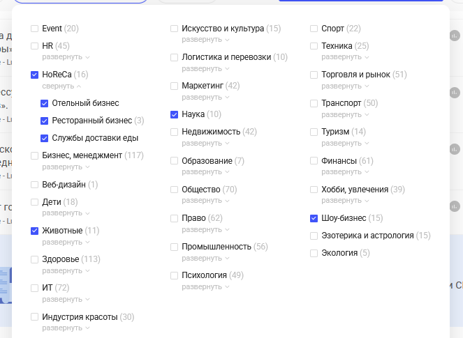 Запросы, которые публикуют журналисты на сервисе, попадают в тематические рубрики. Мы регулярно добавляем новые разделы и более узкие подтемы, чтобы экспертам было удобнее находить запросы по своей специализации. Например, в этом году выделили в отдельные рубрики темы HoReCa, животные, наука, веб-дизайн, шоу-бизнес.
