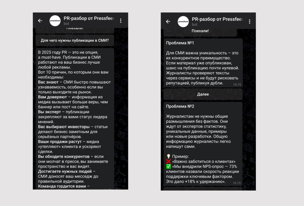 В телеграм-боте «PR-разбор от Pressfeed» вы можете самостоятельно оценить свою текущую ситуацию с продвижением в медиа и проверить стратегию на возможные ошибки. А еще узнать, как эффективнее общаться с журналистами и увеличить конверсию питчей.