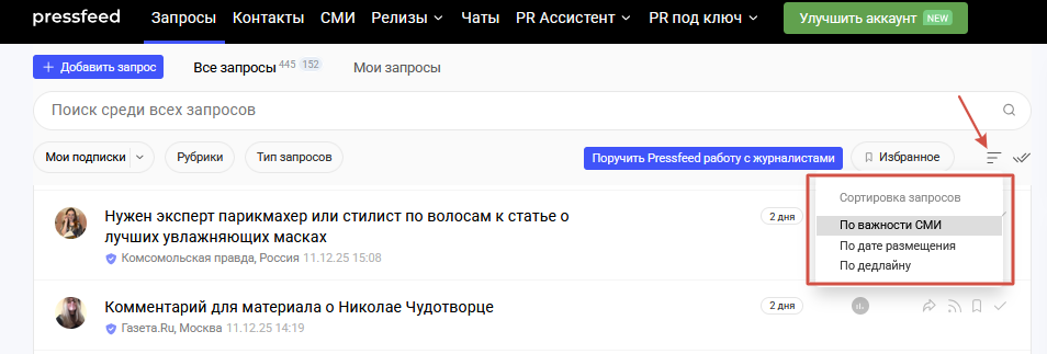 Также теперь пользователь может сортировать запросы не только по дате размещения темы и дедлайну для ответа, но и по важности СМИ. Если выбрать этот параметр, то на первых позициях окажутся запросы из топовых федеральных и отраслевых изданий.
