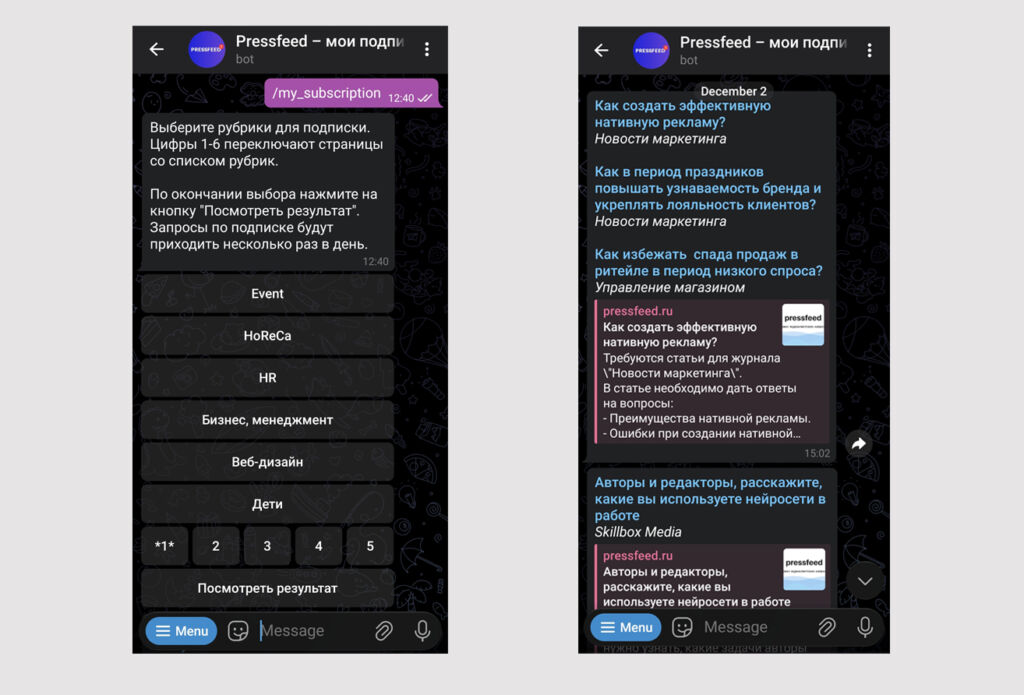 У нас уже есть телеграм-канал «Pressfeed — запросы», в котором автоматически дублируются все свежие запросы с сервиса. Там объединены все тематики и СМИ.Теперь появился более удобный инструмент — бот «Pressfeed — мои подписки». Через этот бот вы можете подписаться на подходящие рубрики и получать уведомления о запросах только на интересные вам темы. Сообщения приходят несколько раз в день, но можно настроить и более редкие оповещения.