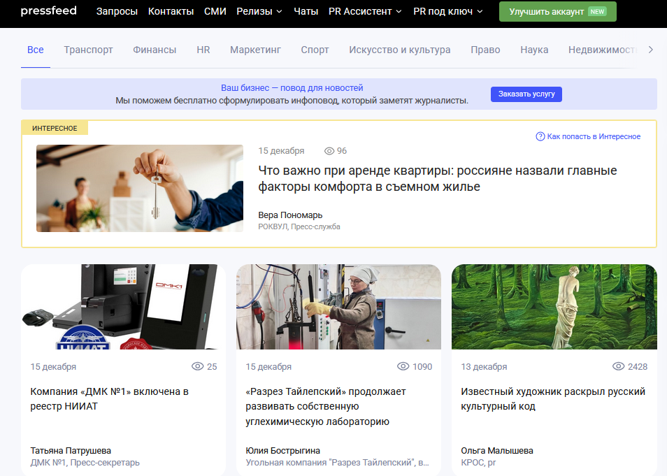 На Pressfeed есть раздел «Релизы», в котором компании публикуют инфоповоды для СМИ.
