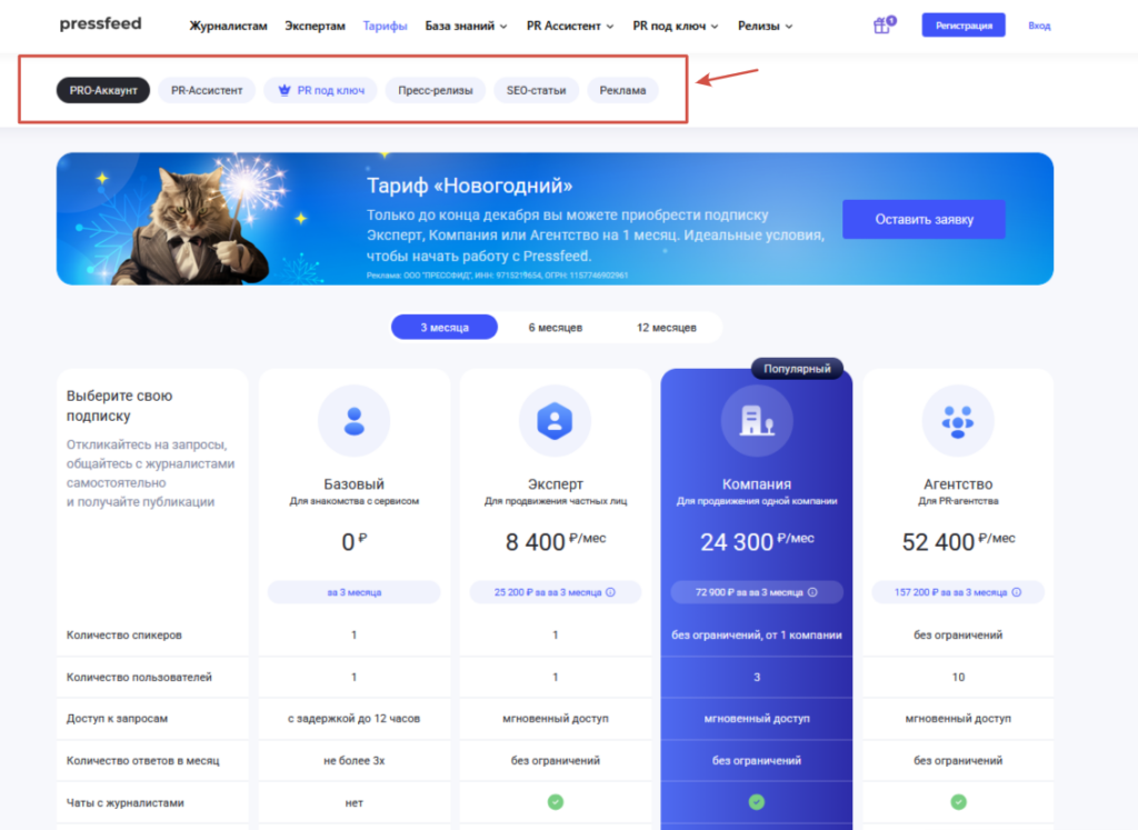 Доступ к PRO-аккаунту, услуги PR-ассистента, PR под ключ, SEO-статьи, рассылка пресс-релизов, реклама в Pressfeed.Журнале, соцсетях и рассылках, — все наши услуги собраны на единой странице с тарифами. Теперь не нужно искать информацию по сайту: переключайтесь между вкладками на панели и изучайте условия.