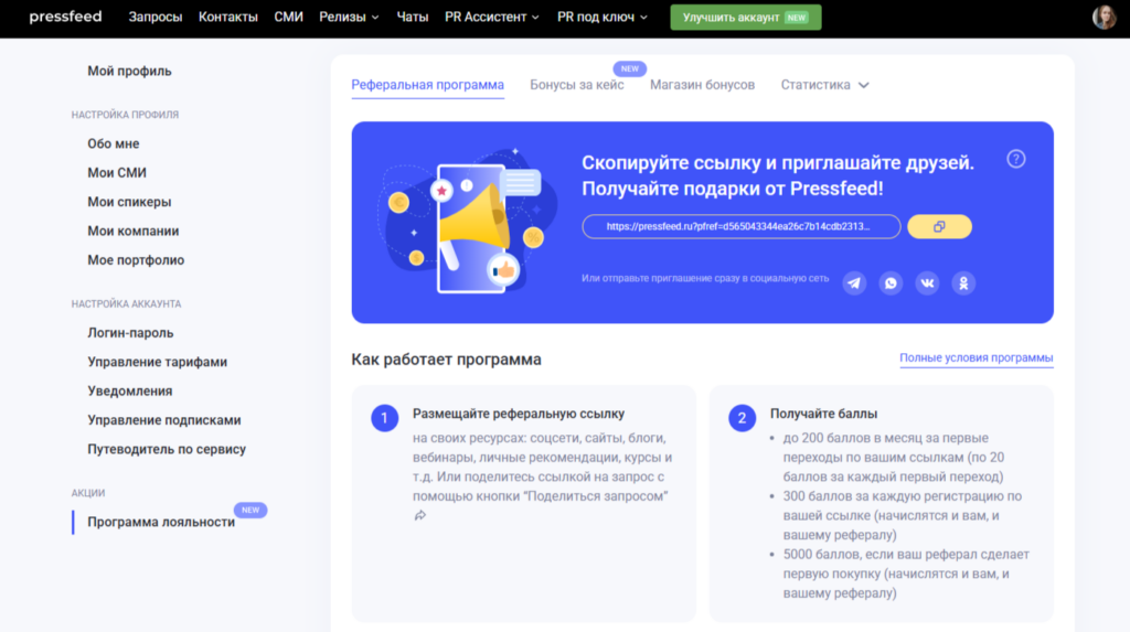 - по 5 000 баллов вам и вашему рефералу за покупку продвинутого тарифа или любой услуги Pressfeed.