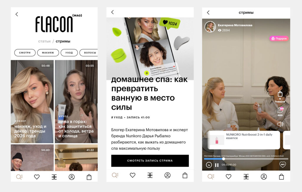 Трансляции проводят на сайте и в приложении, где пользователь может сразу перейти на товар, а также дублируют их в соцсети.
