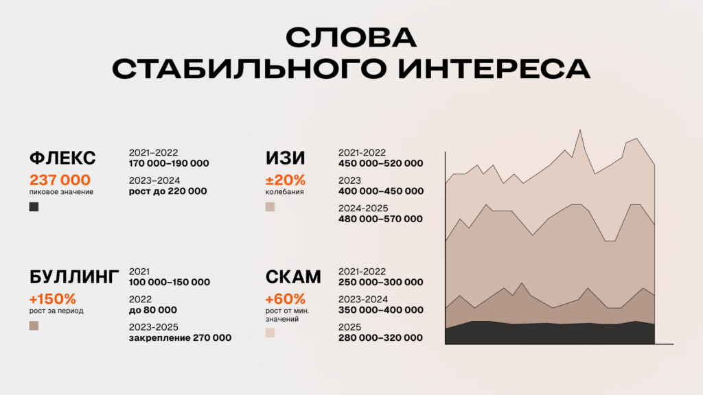 «Флекс» держится на уровне 180–220 тыс. запросов (пики до 237 тыс.), «буллинг» колеблется от 50 тыс. до 270 тыс. с закреплением около 200 тыс. в последние периоды, «изи» остается самым массовым словом с диапазоном 400–570 тыс. и пиками выше 500 тыс., «скам» держится на уровне 250–300 тыс. с пиковыми значениями до 406 тыс.