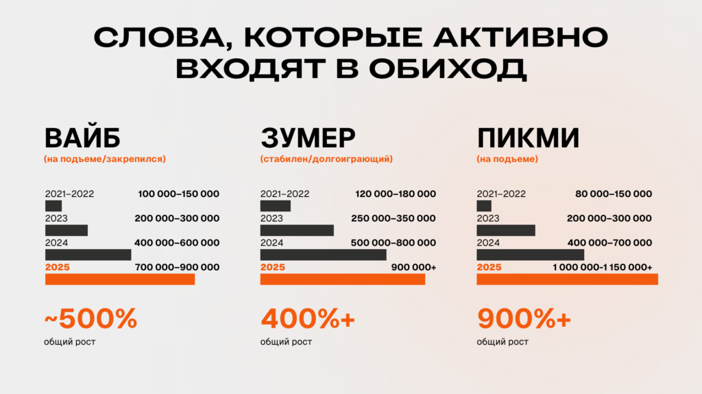 Наиболее показательная группа — слова с растущим спросом. Они демонстрируют кратный рост и выход за пределы узкой аудитории. Например, «пикми» увеличилось с 80–150 тыс. упоминаний в 2021–2022 годах до 1–1,15 млн в 2025 году, что соответствует росту более чем на 900–1000%.