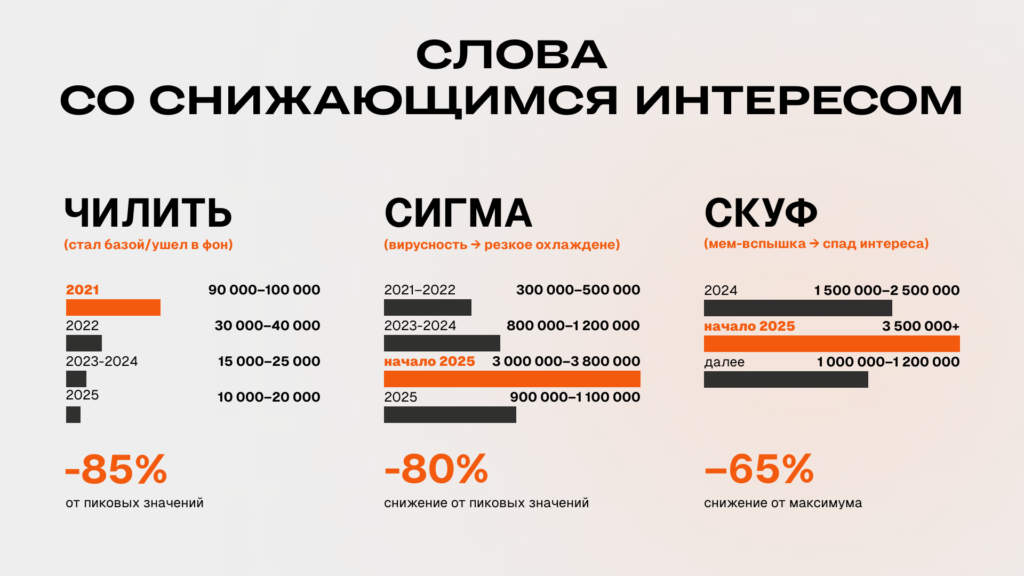 Третья группа — слова с падающим интересом, которые проходят классический цикл «вирус — пик — спад». «Чилить» снизилось с 90–100 тыс. запросов в 2021 году до 10–20 тыс. в 2025 году, что означает падение на 80–85% и переход слова в фоновую лексику.