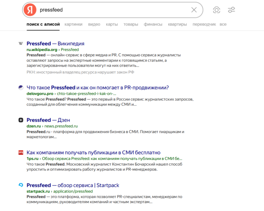 - конкуренция — если в выдаче по названию компании уже есть много других сильных страниц (официальный сайт, соцсети, блоговые платформы, отзовики), статьи в медиа могут отойти на второй план;