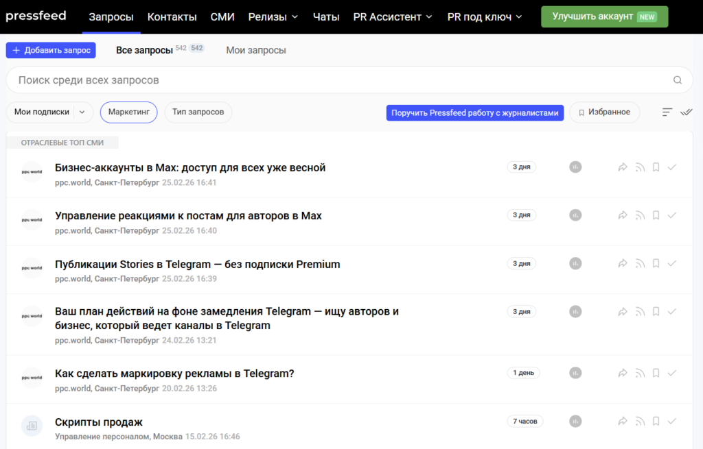 Принцип работы максимально прост: редакции топовых медиа и отраслевых ресурсов постоянно нуждаются в живом опыте и комментариях практиков. Когда специалист делится ценными знаниями, его мнение включают в материал. Для старта предусмотрено три бесплатных питча в месяц. Можно начать работу даже с базового аккаунта — это отличный способ протестировать самопродвижение маркетолога без вложений.