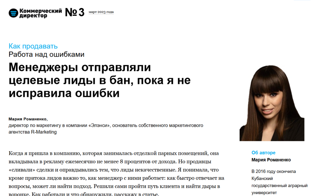 - Социальное доказательство. Ссылка на статью в «Коммерческом директоре» работает убедительнее любого кейса на сайте. Это признание вашей экспертизы на федеральном уровне.