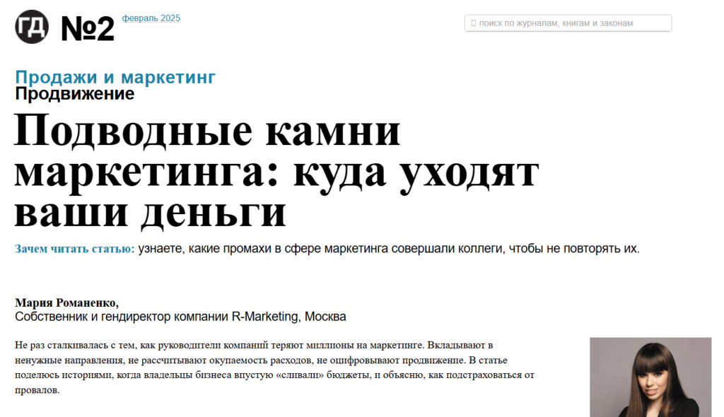 - Статус эксперта. Когда клиент видит публикации в «Генеральном директоре», он подсознательно понимает: вы — игрок высшей лиги. Это повышает средний чек агентства.